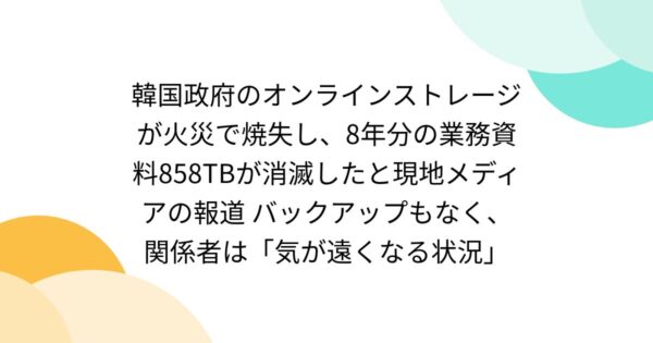 韓国政府のオンラインストレージが火災で焼失し、8年分の業務資料858TBが消滅