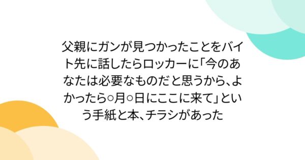 父親にガンが見つかったことをバイト先に話したらロッカーに「今のあなたは必要なものだと思うから、よかったら⚪︎月⚪︎日にここに来て」という手紙と本、チラシがあった