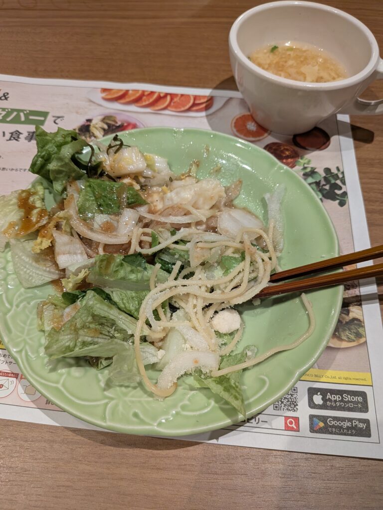 ここの「レタス+玉ねぎ+パスタ+和風ドレッシング」めっちゃ美味い。