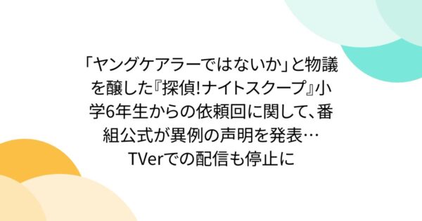 「ヤングケアラーではないか」と物議を醸した『探偵!ナイトスクープ』小学6年生からの依頼回に関して、番組公式が異例の声明を発表… Tverでの配信も停止に